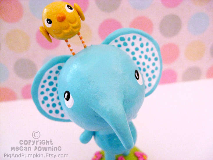 First is one of my teensie charms -- Blueberry the Elephant. Blueberry's colors are based off of the larger sculpture to the right. (can you tell? hehe)